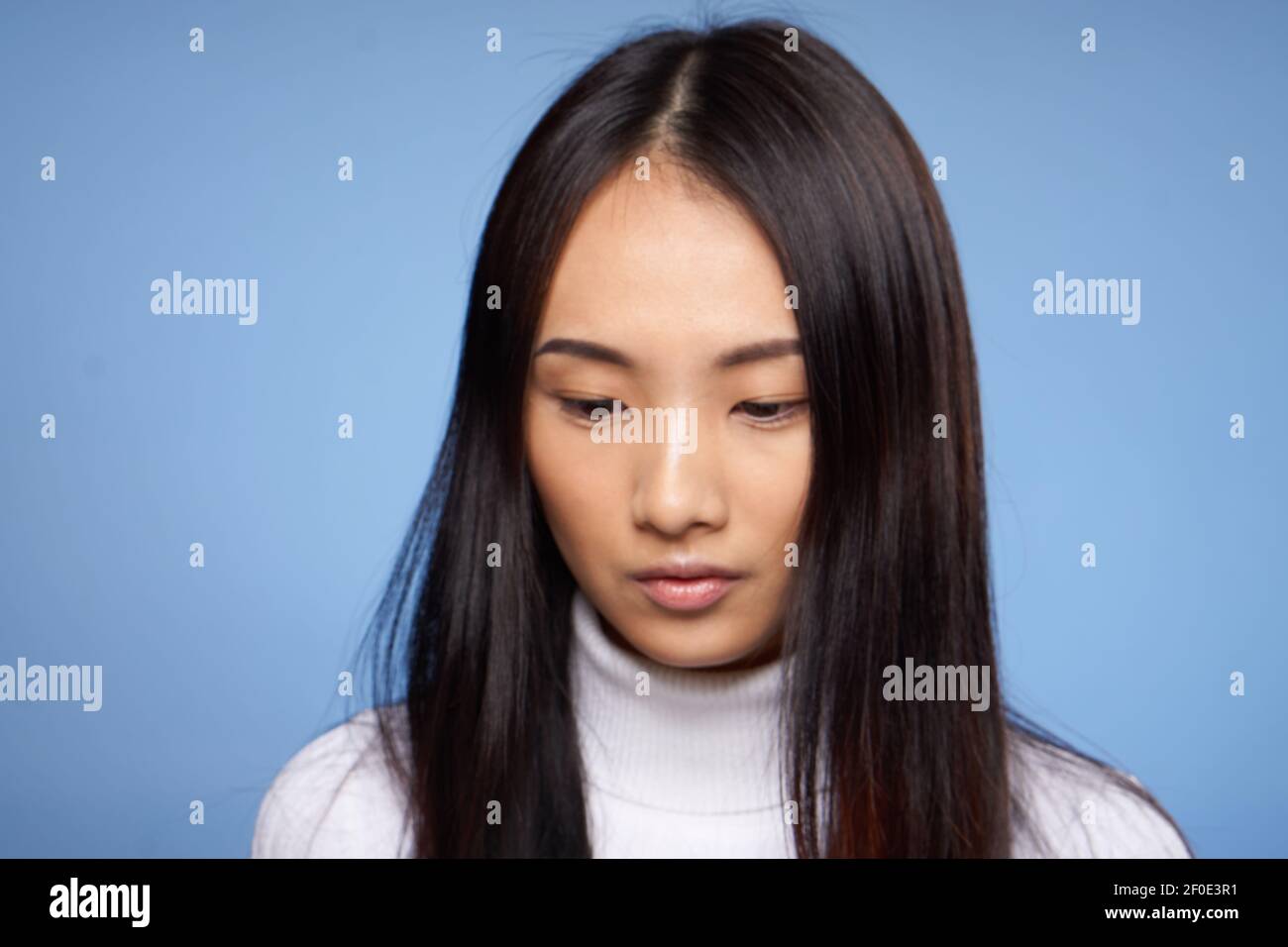 Woman Asian Appearance Portrait On Blue Background White Sweater Model Stock Photo Alamy